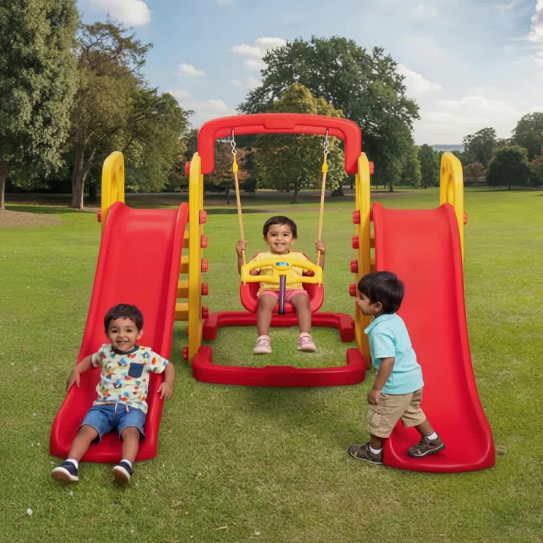 Turn your backyard into a fun-filled play zone with this Double Park Slide with Swing for kids in bright red and yellow colors. Designed to provide both excitement and safety, this outdoor play set combines two wide slides and a sturdy swing into one compact unit. Whether it’s for active mornings or evening playtime, kids will love climbing, sliding, and swinging in their own mini playground. Built for long-lasting durability and joyful memories, it’s the perfect addition to homes, preschools, or daycare centres.